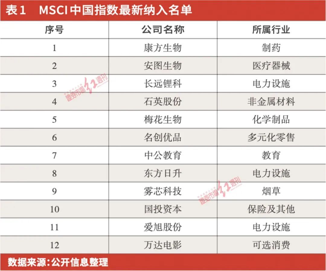 在最新一次的调整中,MSCI中国指数新增了12只标的,其中包括8家A股上市公司(见表1)。