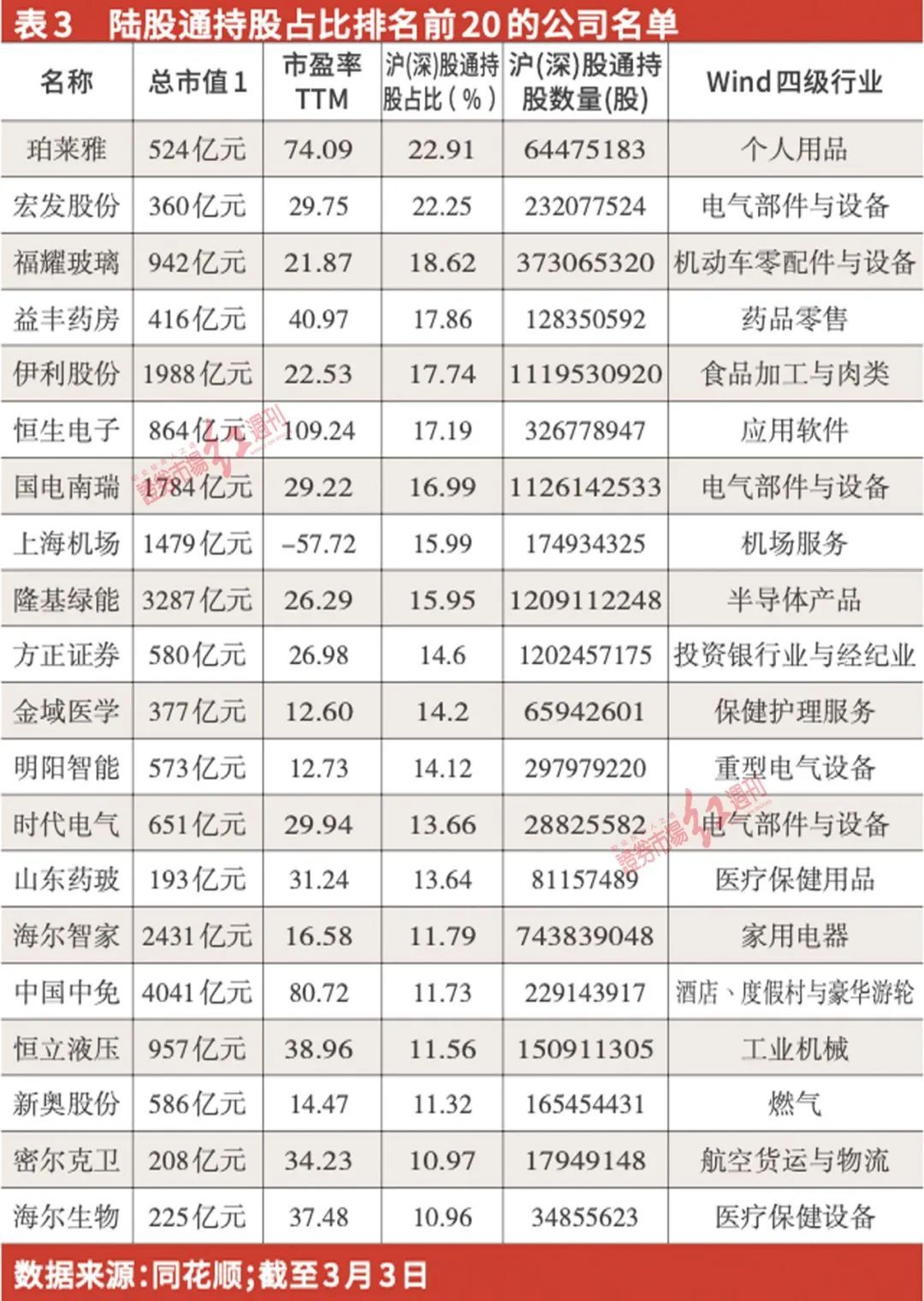 同花顺iFind数据显示,在陆股通持股占比排名前20的公司中,截至3月3日收盘,市值在中盘股范围的标的有宏发股份(600885)、益丰药房(603939)、金域医学(603882)、山东药玻(600529)、密尔克卫(603713)、海尔生物6只,占到总数量的30%(见表3)。